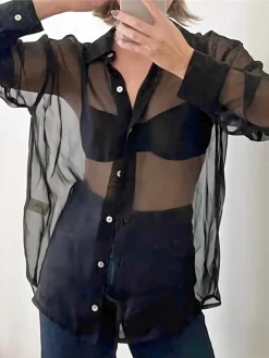 Women Mesh Shirts Long Sleeve Lapel Button Down Loose Tops and Blouse See Through Club Beach Sexy Cover-ups Female Smock