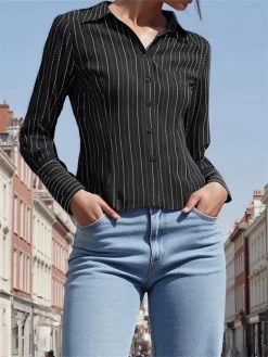 Women’s Button Down Shirts Slim Fit Striped Lapel Long Sleeve Tops for Summer fall Casual Blouses