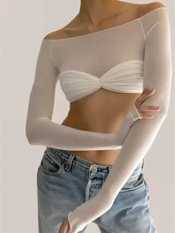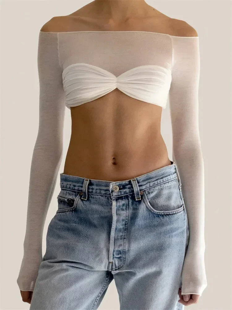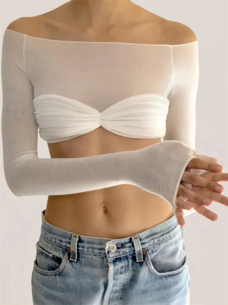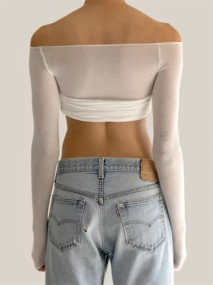 Women T-shirt, Long Sleeve Off-shoulder Pleated See-through Patchwork Ladies Crop Top